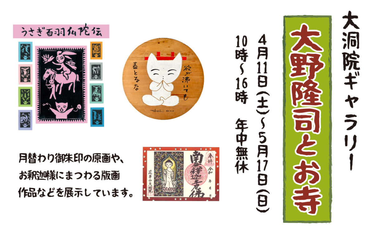 版画家・大野隆司さんは、平成15年に「いぬねこぢぞう」の制作から、大洞院ギャラリー運営、御朱印、壁画の制作まで多大な貢献を頂いています。