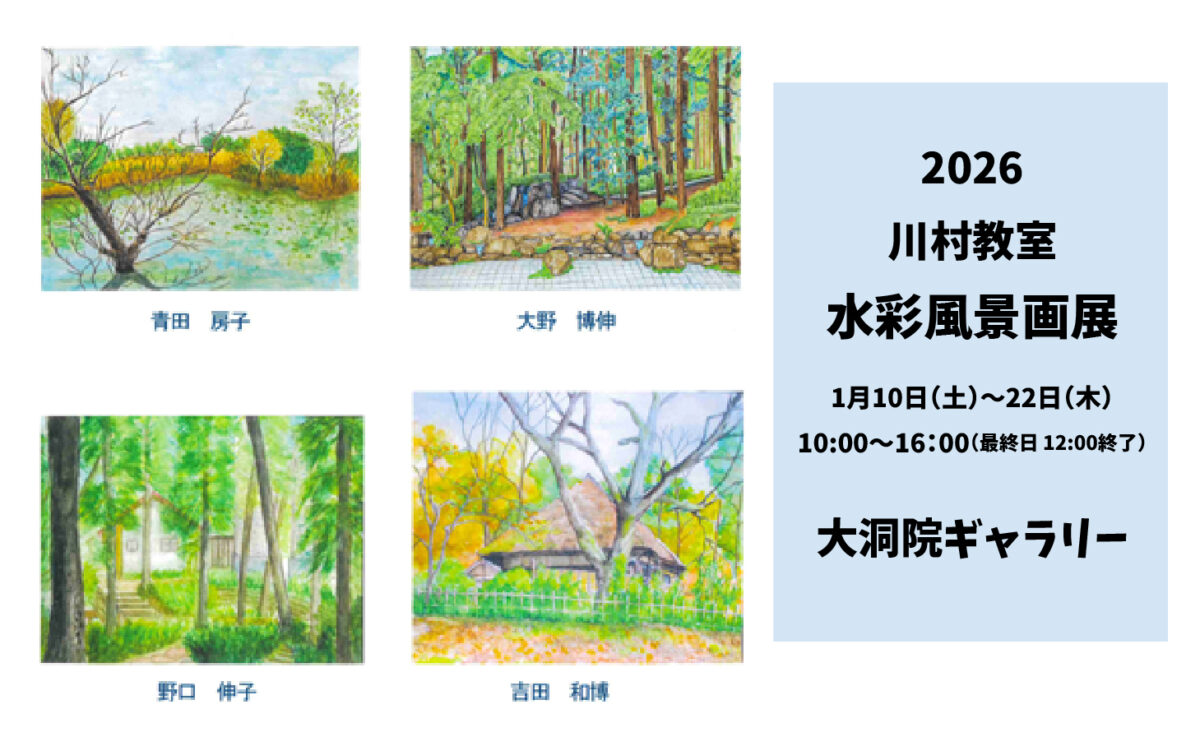ギャラリー 2026.01.09 1月10日~1月22日 川村教室 水彩風景画展 「水彩風景画展」 水彩画教室を開催する川村清先生と生徒の方々の風景を中心とした水彩画作品展です。 会場 大洞院ギャラリー 会期 令和8年1月10日(土)~1月22日(木) 午前10時~午後4時(最終日は正午まで) 入場料 無料 令和8年1月1日 除夜祈祷
