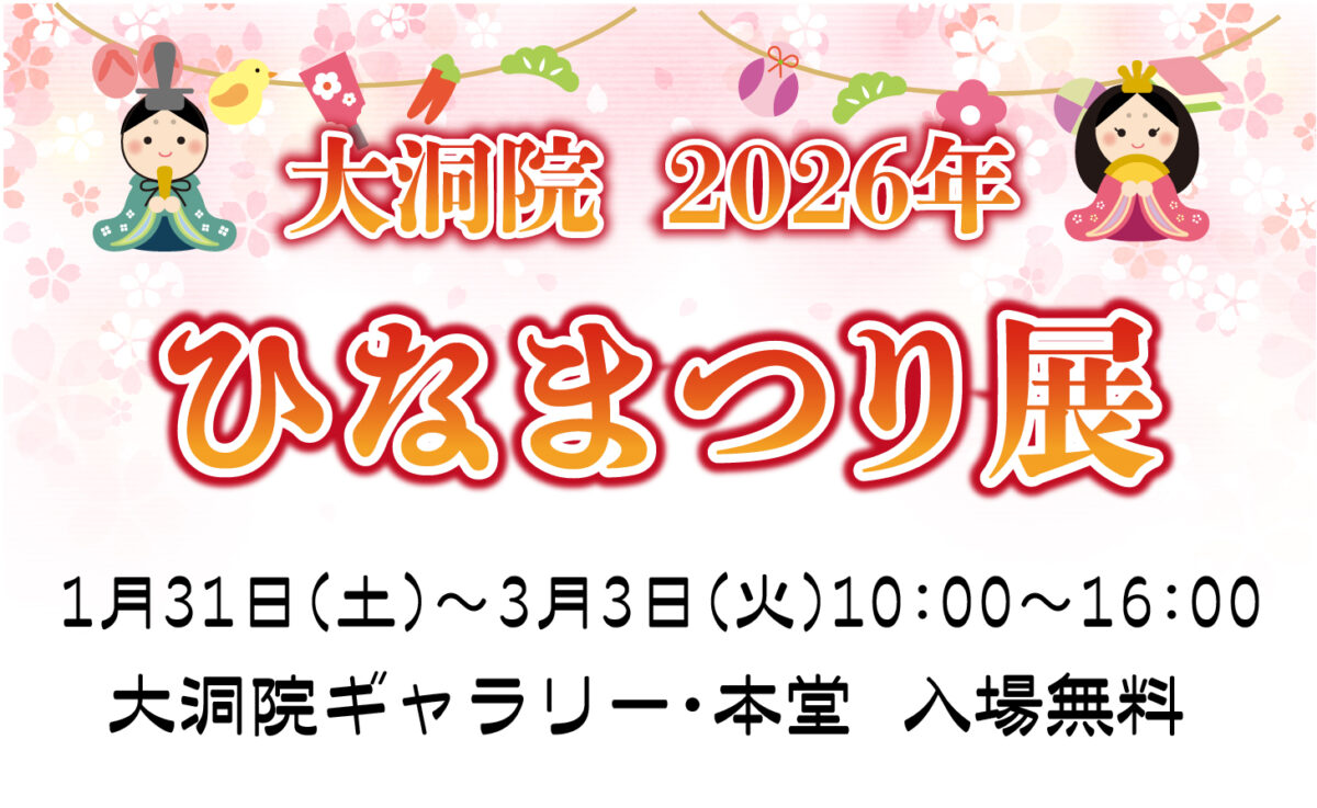 ギャラリー 2026.01.23 1月31日~3月3日 ひなまつり展 大洞院では、毎年皆様より寄せられた雛人形を飾る「ひな祭り展」を開催しています。七段飾り、吊るし雛、帯飾りなどを展示します。 会期 1月31日(土)~3月3日(火) 10:00~16:00 年中無休 会場 大洞院ギャラリー 入場料 無料 ひなまつり展 会場風景 2月1日~3月3日 花野井ひなめぐり令和8年2月 月替わり御朱印